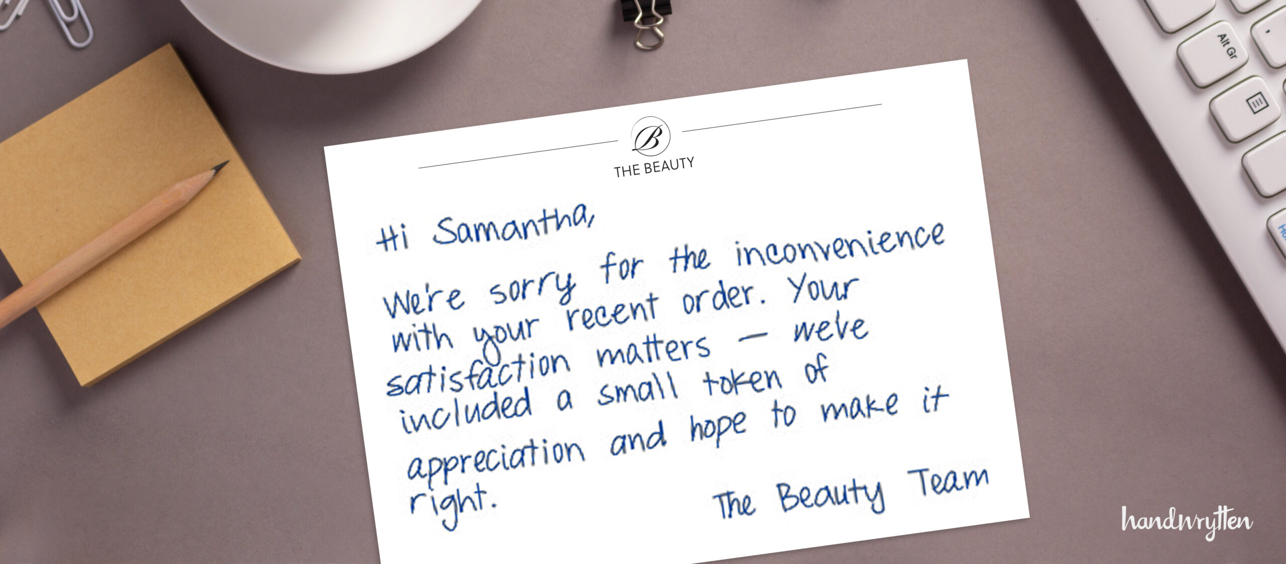 Sample Message for a Recovery Card: “Hi Samantha, we’re sorry for the inconvenience with your recent order. Your satisfaction matters — we’ve included a small token of appreciation and hope to make it right.”