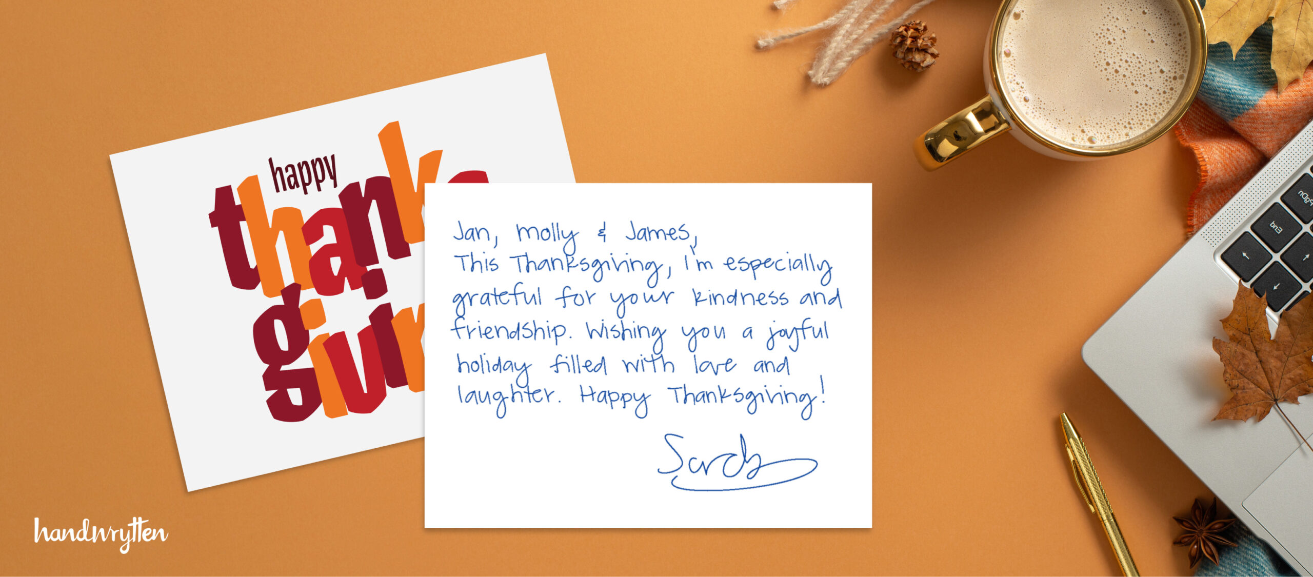 Thanksgiving is a unique moment in the year to pause and reflect on the people who enrich our lives. It’s a time when gratitude naturally fills the air, but in our digital age, expressing thanks can easily become a fleeting text or an emoji in a group chat. To truly stand out and create meaningful moments, it’s essential to give thanks, make it personal—and Thanksgiving cards offer the perfect way to do just that. Incorporating Thanksgiving Cards with Handwrytten adds a unique touch to your expression of gratitude.